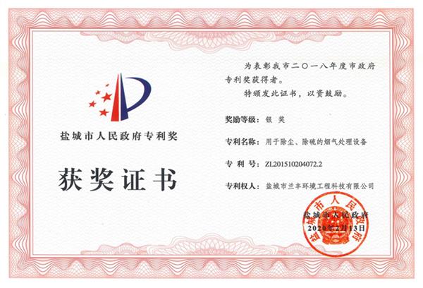2016年底,我司通过知识产权管理体系贯标,贯标以来,我司持续落实管理规范,健全管理机制,规范生产经营各个环节的知识产权管理。专利数量和质量持续提升,创新能力持续增强,2017年,获得盐城市工业企业专利十强,2018年获得国家知识产权优势企业,2019年获得市争星创优科技创新企业,2020年获得市知识产权贯标优秀企业。同时,我司发明专利“用于除尘、除硫的烟气处理设备”获得盐城市人民政府专利奖银奖。