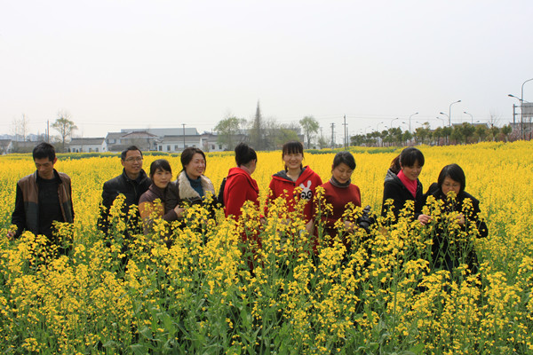 图为我(左二)和同事们在2014年的油菜花地