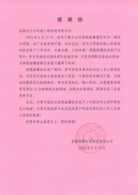 凉风和秋雨之外,今天,我司收到一份珍贵的礼物,海螺水泥给我司发来感谢信。6月底,广东英德遭遇百年一遇的洪涝灾害,我司为英德海螺安装的除尘器控制柜淹水损坏,我司在得到消息后,立即安排李章成和沈浩赶赴并驻守项目,并紧急调配12台电控柜运抵现场,圆满完成抢修任务,助力英德海螺按期全面复产。客户的感谢和认可,鼓舞我们继续前行和不懈奋斗。
