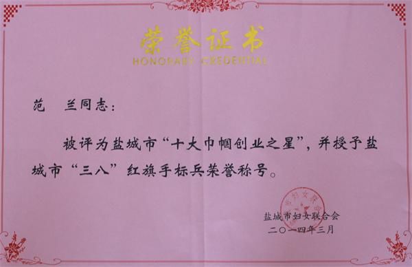 3月26日,由盐城市妇联主办的“巾帼创业竞风流”风采展示活动在文化艺术中心隆重举行。市委书记、市人大常委会主任朱克江,省妇联主席缪志红出席并讲话。兰丰环保公司总经理范兰被评为首届十大巾帼创业之星。