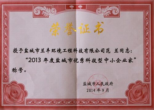 9月20日,盐城市科技创新奖励大会隆重召开。盐城市委书记、市人大常委会主任朱克江出席并讲话。市委副书记、代市长王荣平主持。市委常委、常务副市长戴元湖宣读表彰奖励决定。此次会议,兰丰环保董事长范兰被授予“2013年度盐城市优秀科技型中小企业家”荣誉称号。